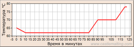 Затереть солод в 80 литрах воды (45oC) Нагреть затор до температуры 62oC, настаивать 60 минут Нагреть затор до температуры 70oC, настаивать 20 минут Нагреть затор до температуры 78oC, настаивать 2 минуты