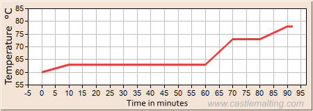 -Mash in 70 liters of water 60oC then gradually raise the temperature to 63oC -Keep at 63oC for 50 minutes -Raise the temperature to 73oC and keep at 10 minutes -Raise the temperature to 78oC and keep during 2 minutes