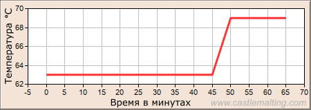 Затереть солод при 63°C, настаивать 45 минут Повысить температуру до 69°C, настаивать 15 минут
