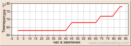 Витримати 40 хвилин при температурі 63°C. Підігріти до 68°C по 1°C/хв. Витримати 20 хвилин при температурі 68°C Підігріти до 72°C по 1°C/хв. Витримати 10 хвилин при температурі 72°C і провести йодну пробу. Підігріти до 78°C по 1°C/хв. Витримати 2 хвилини при температурі 78°C зробити фінальну стадію затирання солоду (меш-аут) Відокремити сусло від пивної дробини і промити водою для пивоваріння при 78°C