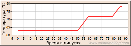 Пауза 50 мин при температуре 63°C. Нагрев до 72°C со скоростью 1 °C/мин. Пауза еще 20 минут при температуре 72°C, йодная проба. Нагрев до 78°C со скоростью 1°C/мин. Пауза 2 минуты при температуре 78°C перед фильтрованием. Далее отфильтровать сусло от дробины. Промывную воду подавать с температурой 78°C.