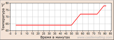 Пауза 50 мин при температуре 64°C. Нагрев до 72°C со скоростью 1 °C/мин. Пауза еще 15 минут при температуре 72°C, йодная проба. Нагрев до 78°C со скоростью 1°C/мин. Пауза 2 минуты при температуре 78°C перед фильтрованием. Далее отфильтровать сусло от дробины. Промывную воду подавать с температурой 78°C.