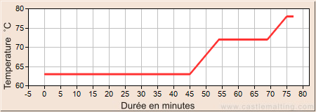 Laisser reposer 45 min à 63°C Augmenter la température à 72°C par 1 °C/min Laisser reposer 15min à 72°C et faire le test à l’iode Augmenter la température à 78°C par 1 °C/min Laisser reposer 2min à 78°C jusqu’à la fin de l’empâtage Une fois l’empâtage terminé, filtrer et rincer avec de l’eau à 78 °C.