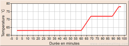 Augmenter la température à 72°C par 1 °C/min Laisser reposer 20min à 72°C et faire le test à l’iode Augmenter la température à 78°C par 1 °C/min. Laisser reposer 2min à 78°C jusqu’à la fin de l’empâtage. Une fois l’empâtage terminé, filtrer et rincer avec de l’eau à 78 °C.
