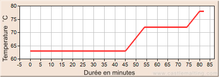 Laisser reposer 45min à 63°C Augmenter la température à 72°C par 1 °C/min Laisser reposer 20min à 72°C et faire le test à l’iode Augmenter la température à 78°C par 1 °C/min Laisser reposer 2min à 78°C jusqu’à la fin de l’empâtage Une fois l’empâtage terminé, filtrer et rincer avec de l’eau à 78 °C.
