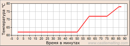Затереть солод в 80 литрах воды при 62°C, настаивать 50 минут Повысить температуру до 72°C, настаивать 15 минут Повысить температуру до 78°C, настаивать 2 минуты