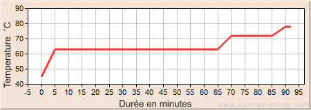 -Empâter le malt dans 80 litres d’eau (45°C) -Palier 63°C : 60 minutes -Palier 72°C : 15 minutes -Palier 78°C : 2 minutes