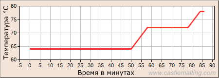 Пауза 50 мин при температуре 64°C. Нагрев до 72°C со скоростью 1 °C/мин. Пауза еще 20 минут при температуре 72°C, йодная проба. Нагрев до 78°C со скоростью 1°C/мин. Пауза 2 минуты при температуре 78°C перед фильтрованием. Далее отфильтровать сусло от дробины. Промывную воду подавать с температурой 78°C.
