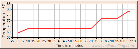 - Mash in 70 liter water bij 59°C and geleidelijk de temperatuur verhogen tot 63°C